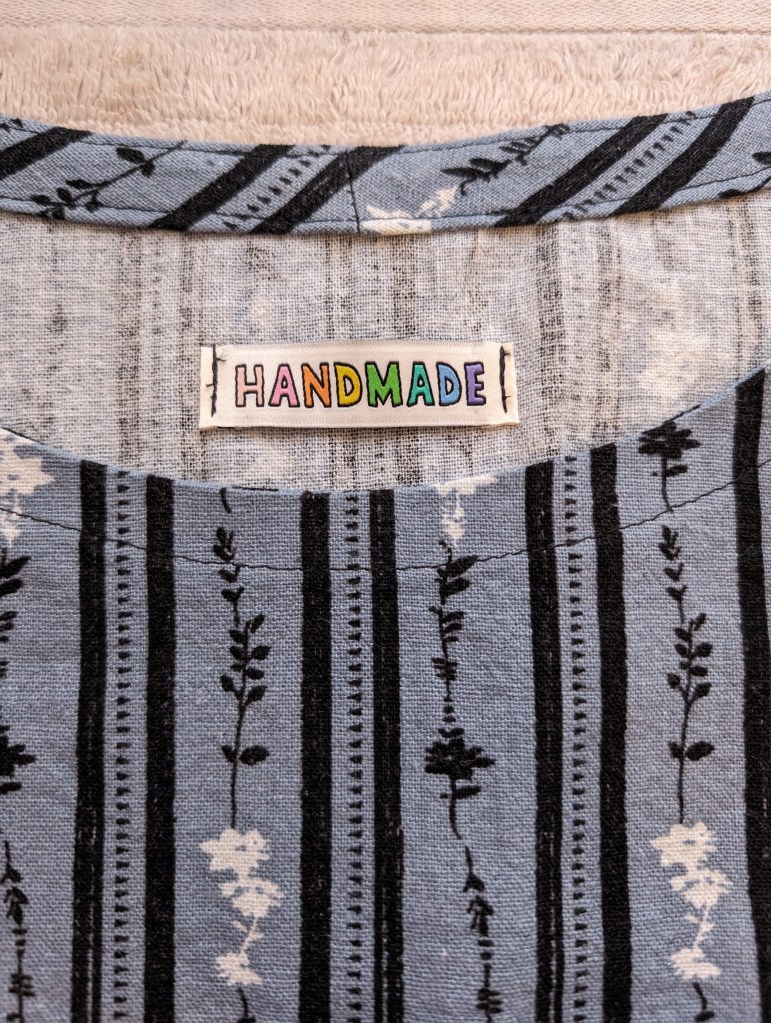 I feel especially proud because while I didn’t explicitly set out to pattern match the pocket, I did have the thought of at least aligning the stripes of the pocket to the main body of the tunic. I also got these very cute “Handmade” tags from Blackbird Fabrics, and I sewed that to the back, just under the neck binding. I love the photo because you can also see the black stitching and how it looks on the fabric.