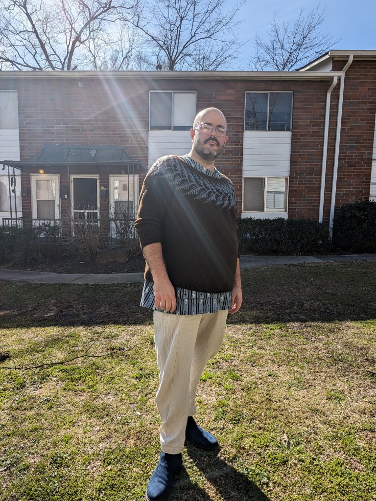 - The brown sweater with blue colorwork I’m wearing below is Forestland by Jennifer Steingass. Unfortunately, it doesn’t look like Jennifer has an off-Ravelry store.